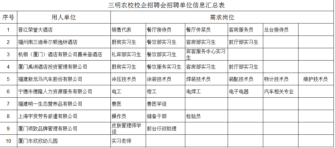 三明农校校企招聘会招聘单位信息公示