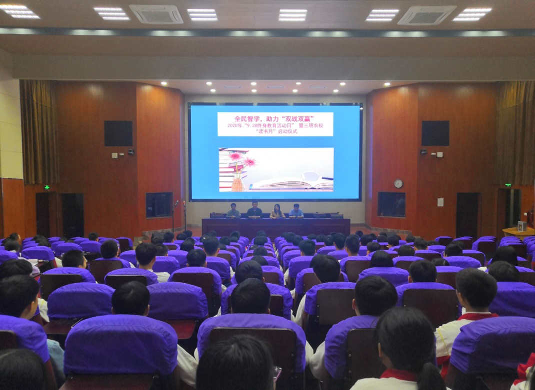 近日来,全省各地踊跃举办9.28终身教育宣传、全民读书月等相关活动,营造浓厚的终身学习、全民阅读氛围。三明农校结合“书香墨香校园”创建工作,于9月28日晚上,以学校报告厅为主会场,各班级通过班班通收看,召开了2020年“9.28终身教育活动日”暨校园读书月启动仪式。