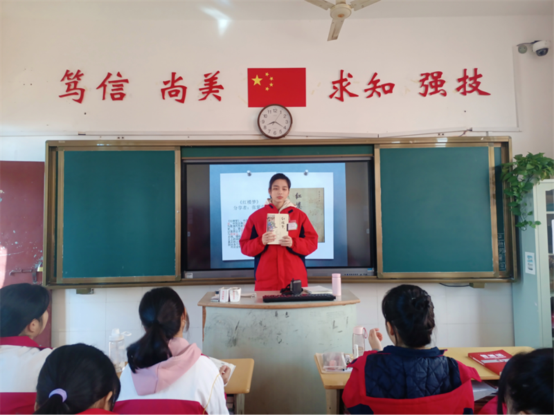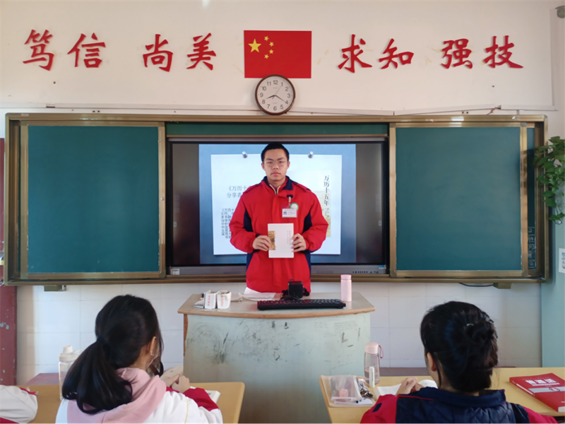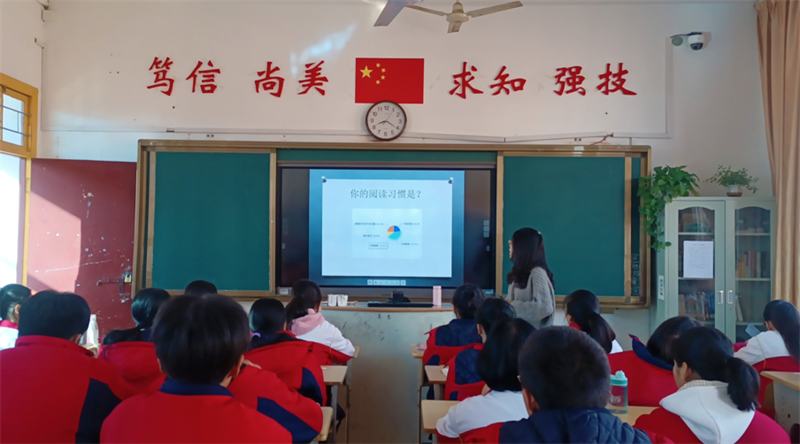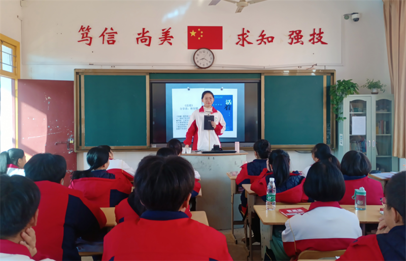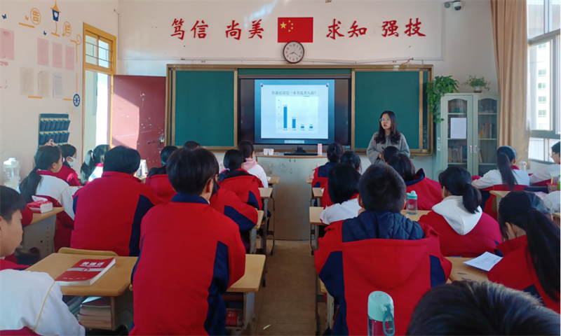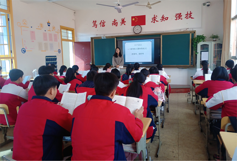 同学们分享结束后,老师向大家提出阅读要求:充分运用晚自习时间,每天至少阅读半小时;每人每周写一篇300字以上的读书笔记,好的篇章可以在课间及晚自习的时间进行朗读!