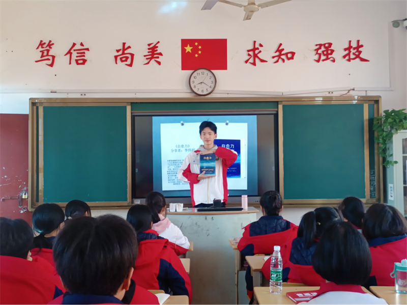 随后,由七位同学逐一分享读书体会。分享的书籍有小说,也有历史类、情商心理类的,还有赫赫有名的中外名著。班级同学在轻松愉悦的氛围之中开启一场浸润书香的心灵之旅。