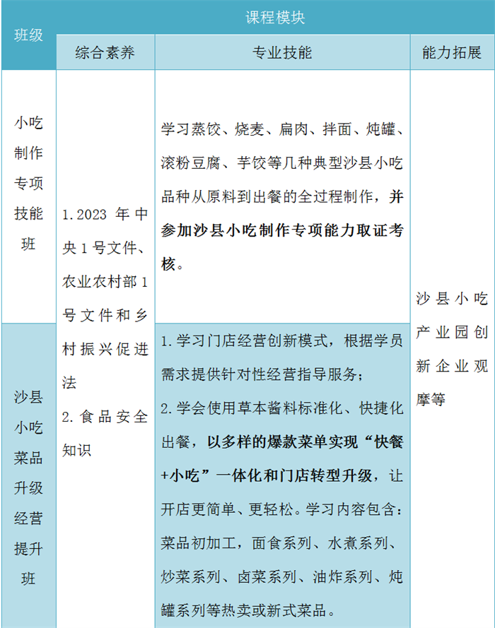 四、培训内容:举办一期沙县小吃制作专项技能培训班和两期沙县小吃菜品升级经营提升培训班。每期5天。区别如下:
