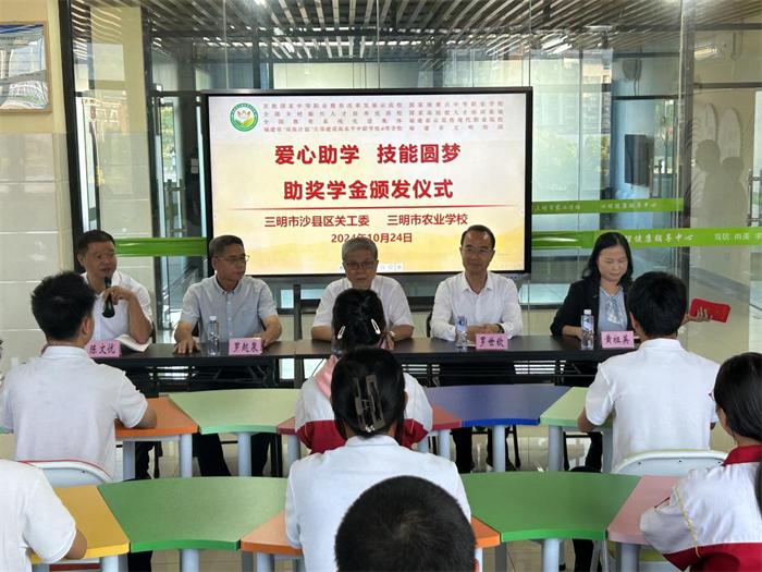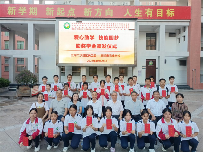 2024年10月24日下午,三明市农业学校举办了三明市沙县区关工委“爱心助学 技能圆梦”2024年度助奖学金颁发仪式。三明市沙县区关工委主任陈应添、常务副主任罗起泉、副主任黄祖英,三明农校党委书记、校长罗世钦、党委委员副校长陈文优等领导出席此次活动,共同见证这一温馨而意义深远的时刻。