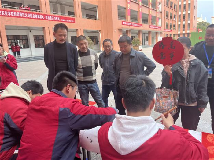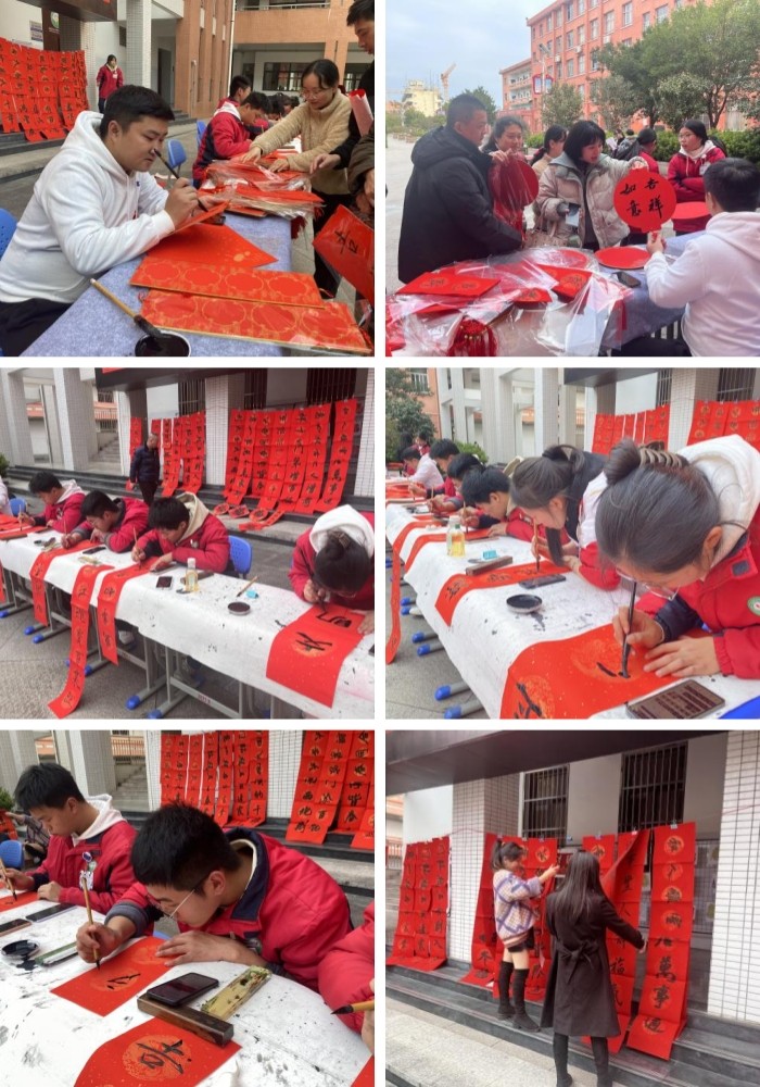 活动当天,在三明农校青年党员孙启煌老师带领下,学校书法社成员们手执毛笔,在红纸上挥墨泼毫,一幅幅春联跃然纸上。这些春联,既有传统的吉祥话语,也有充满创意与时代感的佳作,每一笔每一划都透露出书写者的用心与热情。